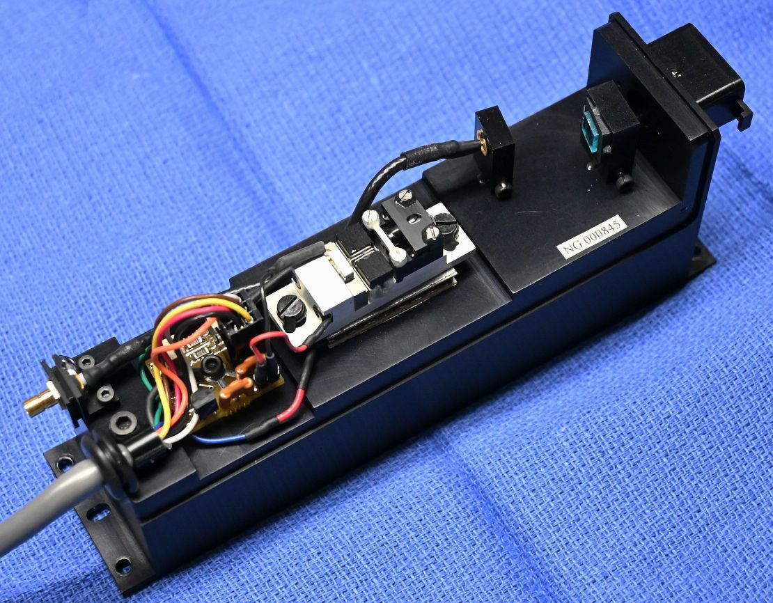 The laser head consists of the flashlamp and YAG rod in a sealed box, the KTP doubling crystal (outside the cavity), servo controlled apertures (variable slits) for X and Y spot size, and a servo controlled attenuator to adjust pulse energy. Note that this attenuator approach is much simpler and more consistent than alternatives using adjustable capacitor voltage or pulse duration control.
