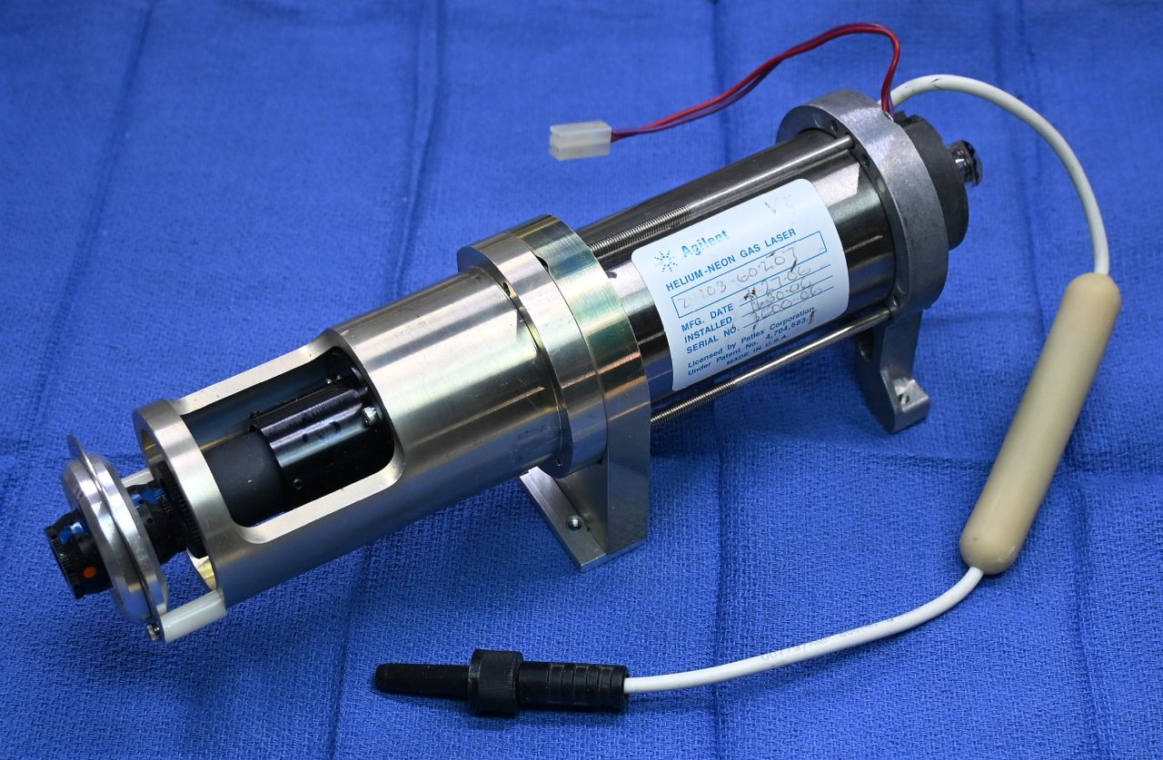 Although the label on the HeNe laser tube says Carl Zeiss, there is no doubt that it is made by Siemens: The model is LGR-7621-S, which is a current Siemens/LASOS model, and the remainder of the label is Siemens style. So, what about this is not clear? :) It is about 10 inches in length with anode-end output and a rated output power of 2 mW. (Its label also has the same irrelevant reference to Patlex patent number 4,704,583 as most HP/Agilent tubes discussed elsewhere in this chapter - and it is equally irrelevant for this one.) The normal dual mode thermal control technique is used with feedback provided by a pair of reflections from the uncoated surfaces of the roof prism - the one from the front, and the other through and back off the opposite surface. Polarizers oriented at 90 degrees select the two modes for the the photodiodes.